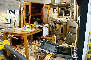 | 大地震発生直後の状況が再現されているブースではショックで身体が凍り付いて、揺れてもいないのに身動きが取れないくらい。 |