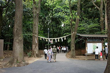 | 色んなパフォーマンスを眺めながら歩いて行くとすぐに、明治神宮の南参道入り口に到着です。 |